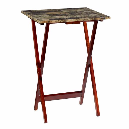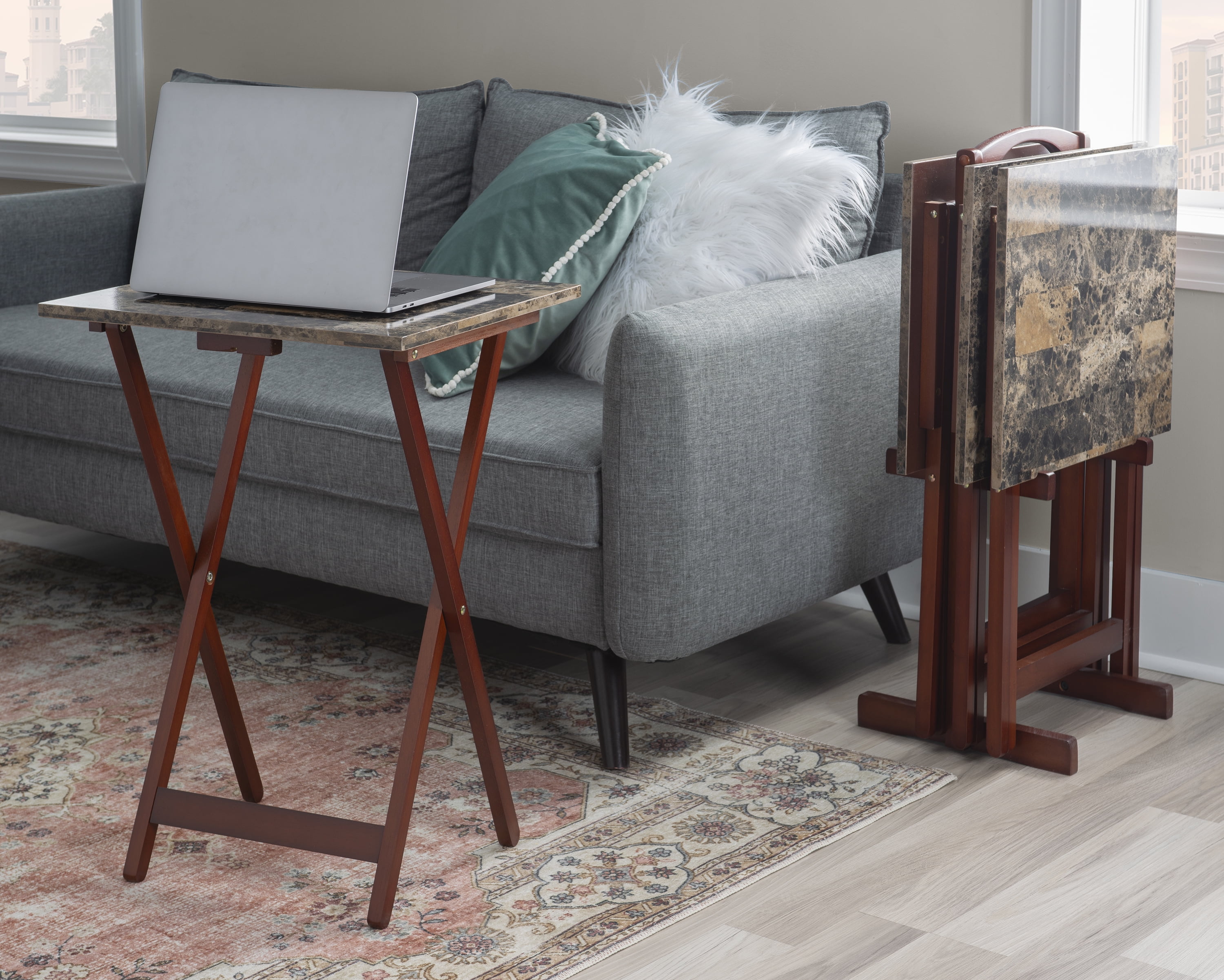The brown faux marble rectangular tv table set has a distinctive look with its sturdy wood construction and faux brown marble top. A true home furnishings staple. Crafted from rubberwood, faux marble paper and mdf. The handle at the top of the stand allows easy transportation, letting you carry the trays from each room. It includes 4 foldable trays and a storage stand with a handle on the top that makes it easy to transport the entire set from one room to another.